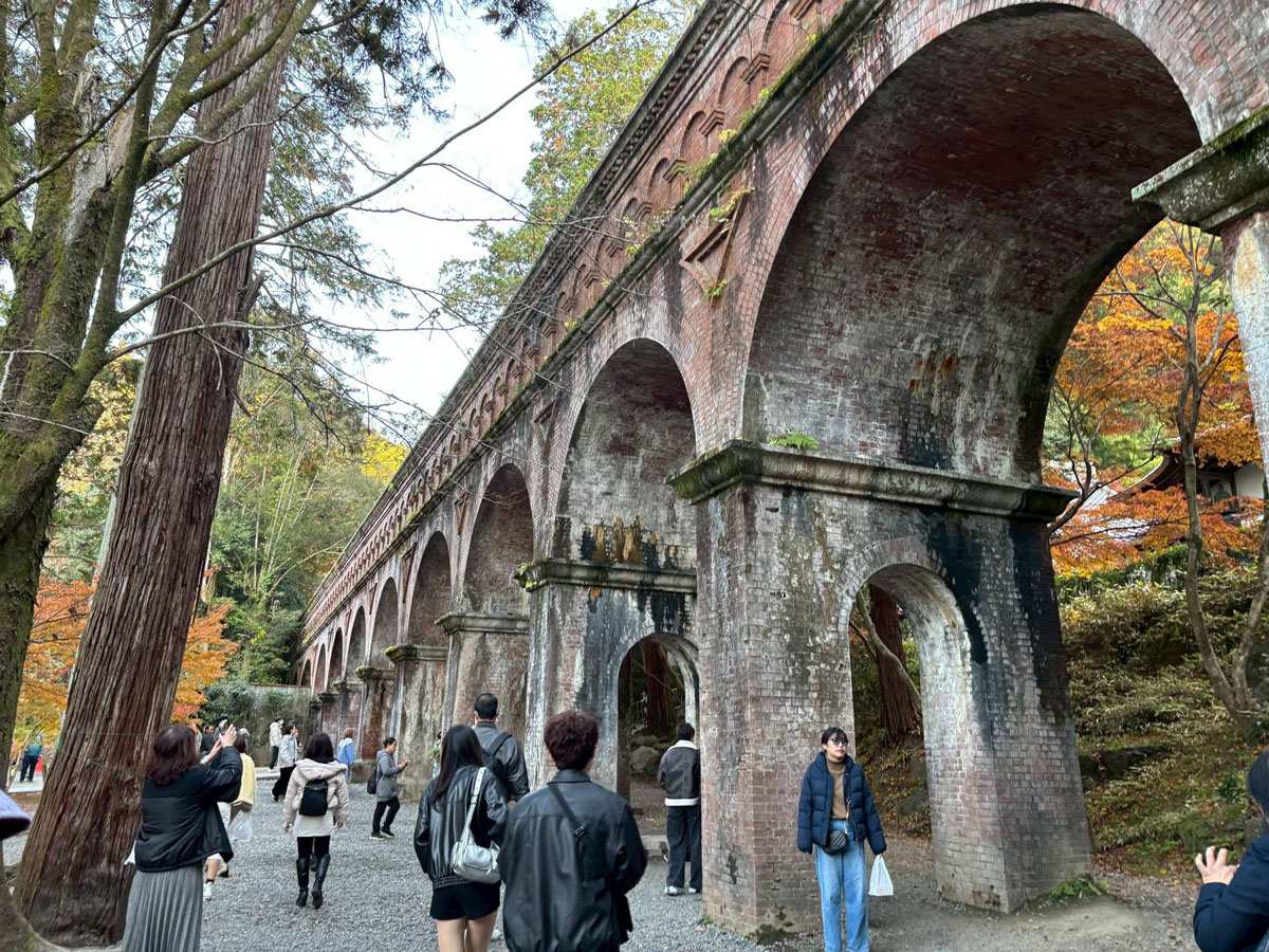 天授庵を出た後は更に坂を上がり、旅の最終地点である水路閣へ到着。国宝に指定された水路閣は、既にたくさんの人で賑わっていました。紅葉と水路閣の組み合わせは幻想的で、旅の終着点に相応しい華やかな雰囲気に包まれていました。参加者のメンバーも、橋の下でかわりばんこに写真をパチリ。とってもいい記念写真となったのではないでしょうか。
